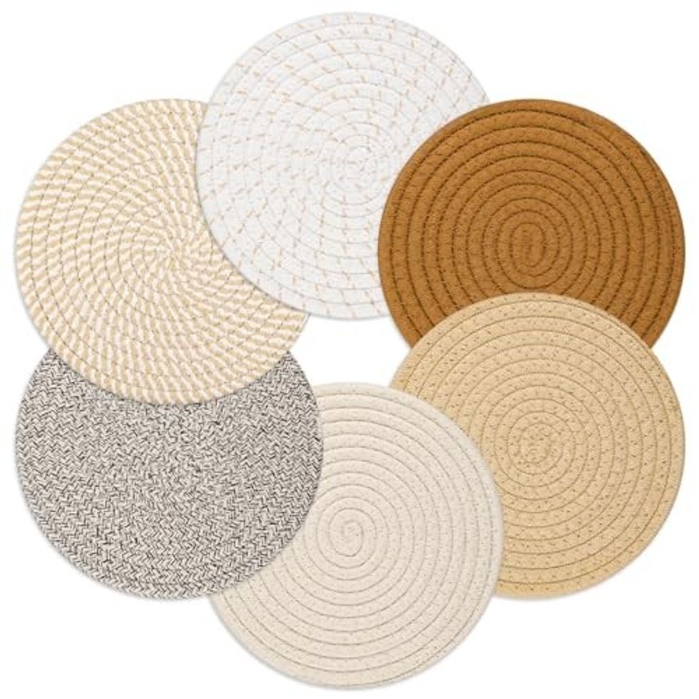 Style your kitchen with these trivets, which help to cover hot dishes and protect surfaces. The hot pads, made from cotton ropes, blend boho and farmhouse styles to add a cozy touch.
