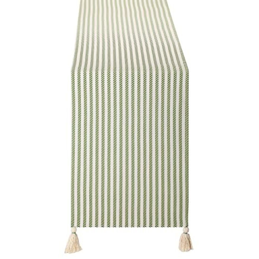 This cotton farmhouse-style table runner with forest green stripes is perfect for fall decor. With its tassel details, the runner is also great to add texture to your tablescape.