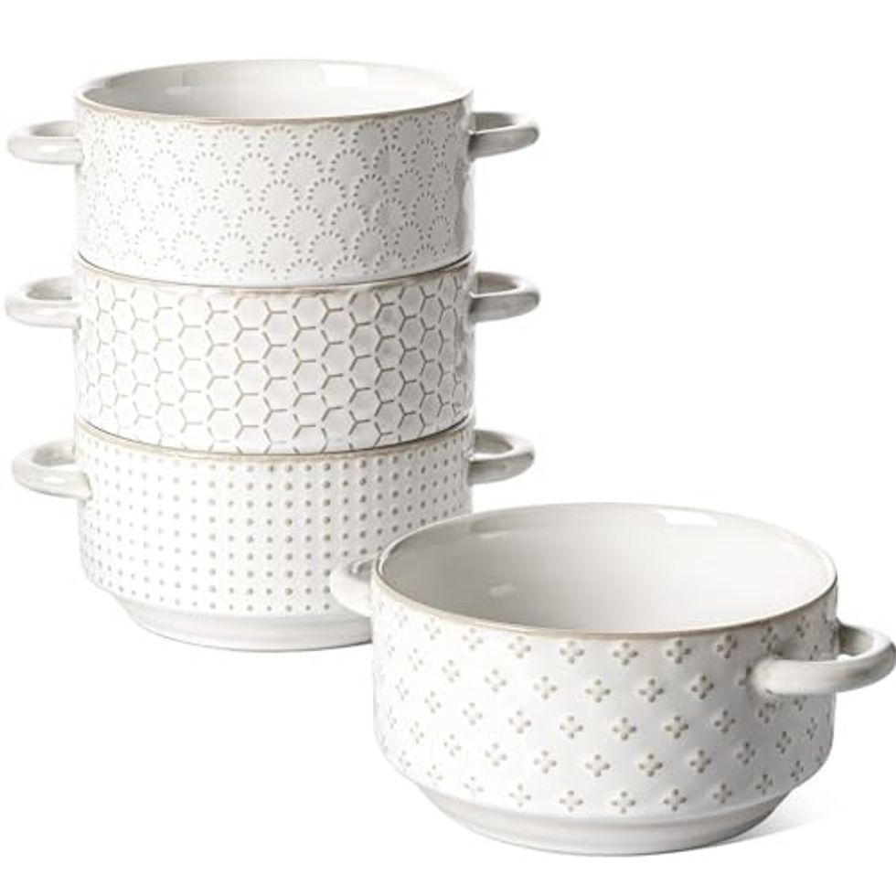 LE TAUCI's embossed ceramic bowls are so beautiful that you'll be inspired to make a nice bowl of soup just for an excuse to use them. Each of the four bowls is decorated with a different yet coordinating pattern. The bowls are heat-resistant to 500°F and dishwasher-safe.
