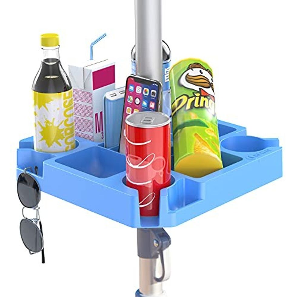 Enhance your beach umbrella experience with this practical tray table that offers space for snacks, a Bluetooth speaker, and four cup holders. The included pole adapter fastener ensures compatibility with any umbrella pole. It's the perfect accessory to complete your beach setup.