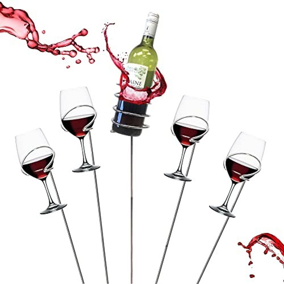 Elevate your beach experience with these outdoor wine holders. Designed to hold your wine glass securely in the grass, they also come with a stand for your wine bottle. Enjoy your favorite wine in a convenient and stylish way. This is a game-changer for beach picnics and summer gatherings.