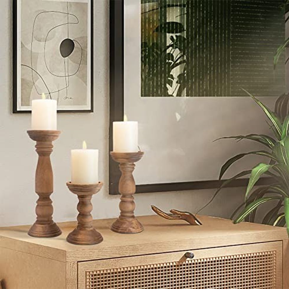 Every cozy space needs a few candles, and these wooden candle holders are the perfect way to display your favorite scents. This set of three features a rustic wood design that adds warmth and charm to any decor theme.