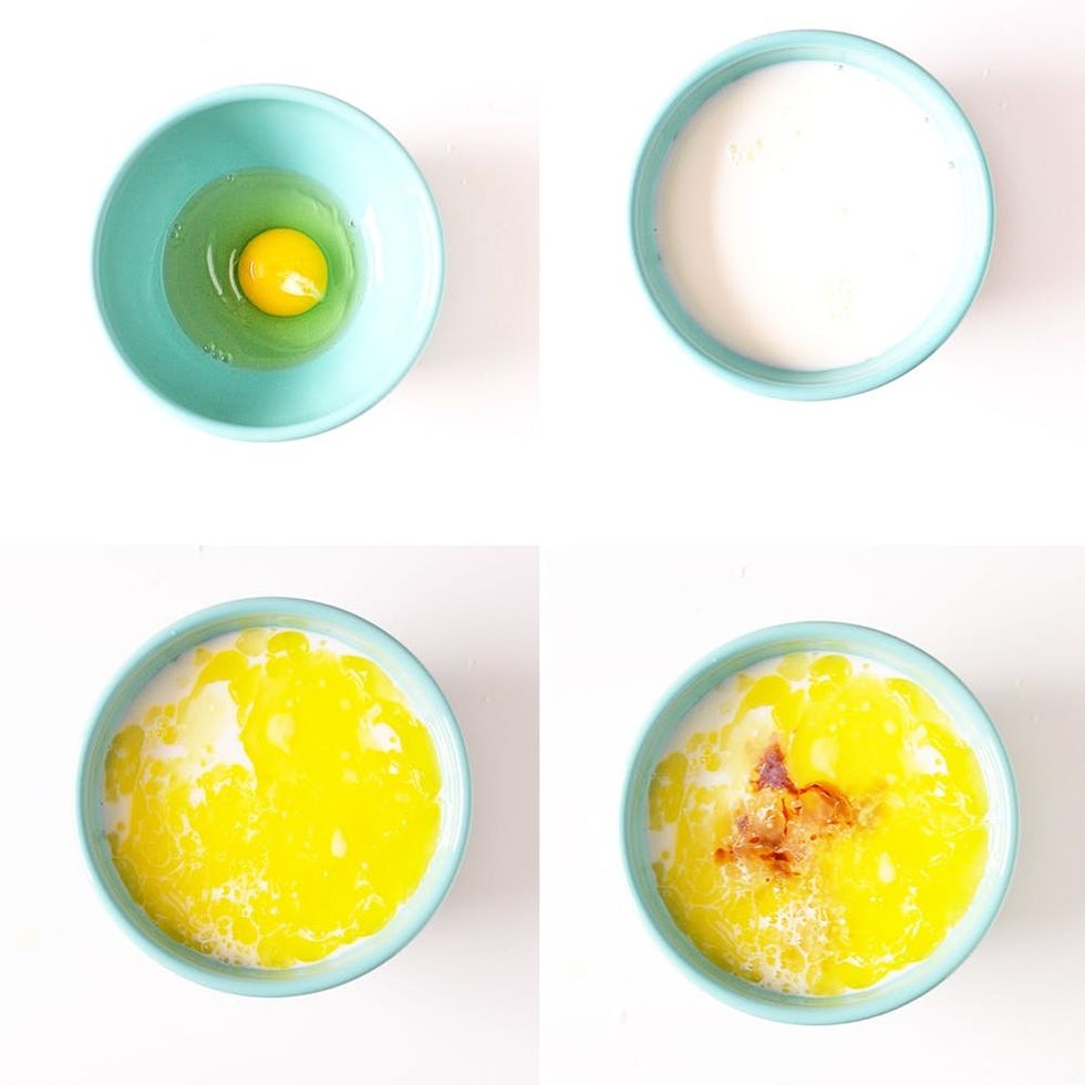 1. Put all the wet ingredients (egg, milk, vanilla, melted butter) into a medium-sized bowl and mix together until completely combined. Put to the side.