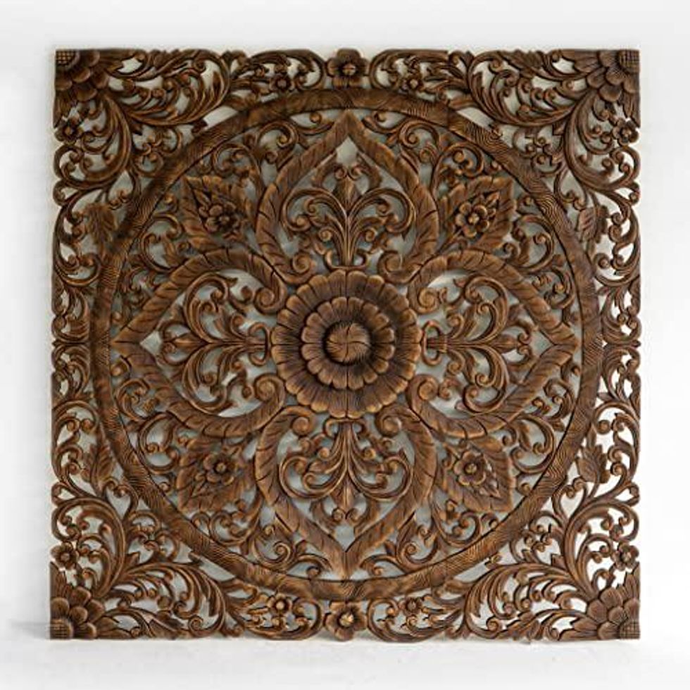The hand-carved work of art can be used as a headboard for a queen bed or as a beautiful wall hanging. The piece consists of 3 Hand-Sculpted Wood Panels made of reclaimed Teak wood. "This carving exhibits a captivating three-dimensional motif of vines and lotus blooms." "These carved wood headboards are made by hill tribe artisans of northern Thailand."