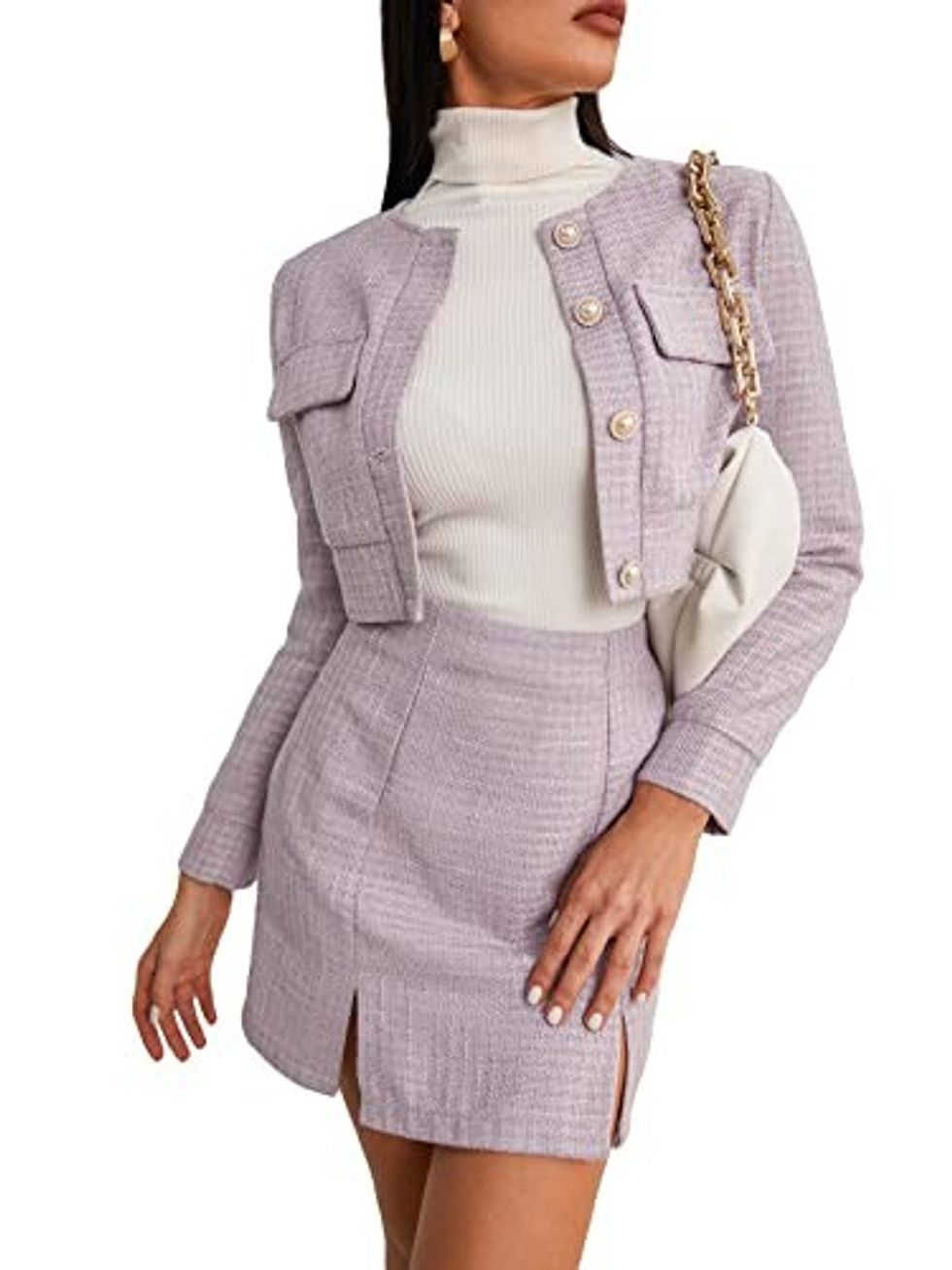 Don't worry, this isn't your granny's tweed suit from the 80s. This 2-piece tweed set gives a trendy twist on this classic style, with a cropped blazer and fitted mini skirt. Choose from several gorgeous color and layer it with a simple turtleneck or ribbed tee for an easy and elegant look that'll have you feeling ultra high class.