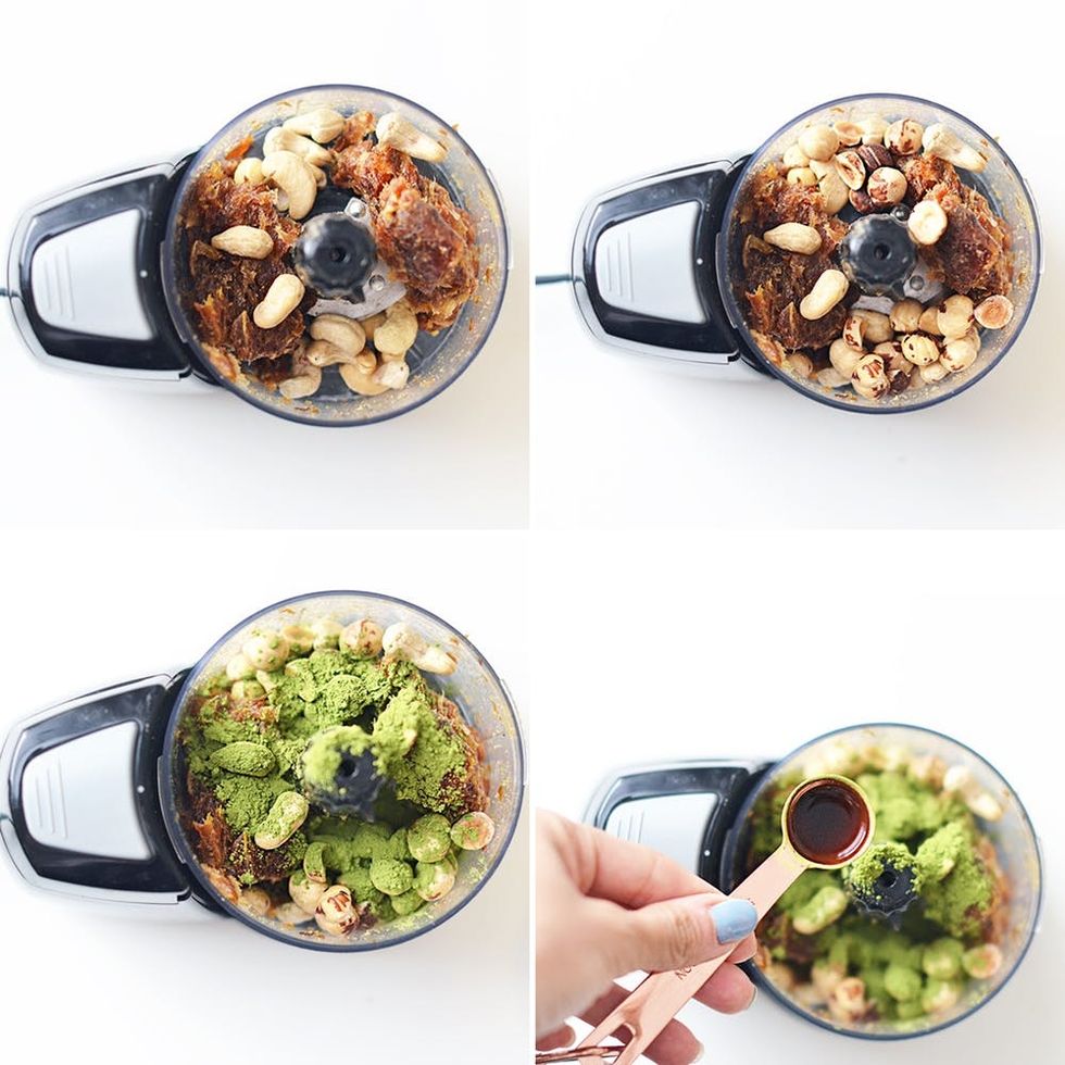 Next, add the cashews, hazelnuts, matcha powder, and vanilla extract.