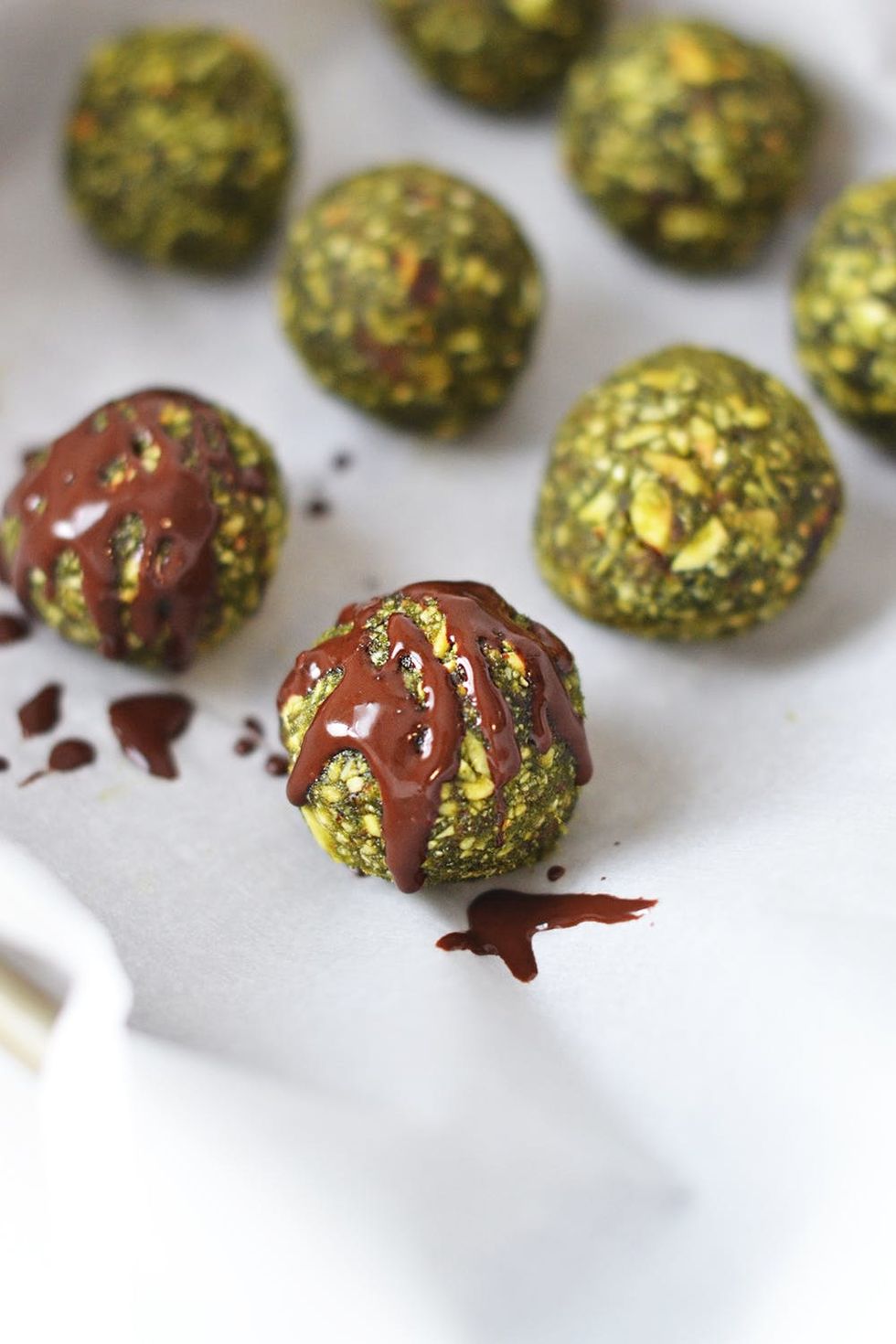 With a spoon, drizzle a little bit of the chocolate on top of the balls and place them in the freezer for a minimum of 15 minutes. Take them out when you’re ready to eat.
