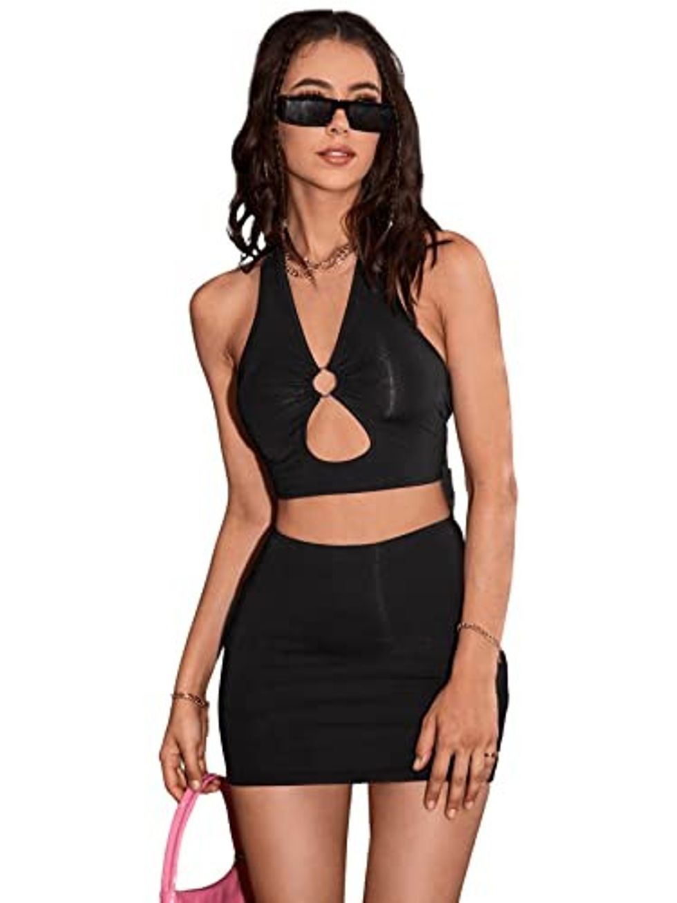 This Romwe two-piece cut-out crop top and skirt set is a stylish ring link cut-out halter crop top paired with a mini bodycon skirt that's perfect for a night out. Step up your fashion game and slay the look all night long.