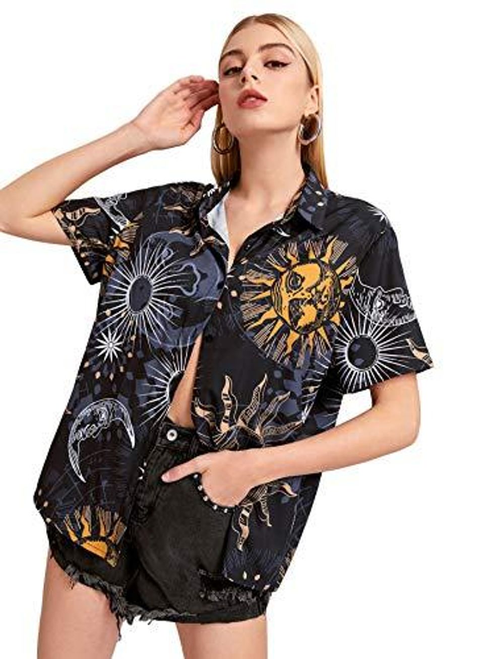A boxy fit is a great way to show off your grunge in the best way possible. This Cute Print Button Down is oversized and designed to be worn open or closed. It would look great with any of the basic crop tops on this list!