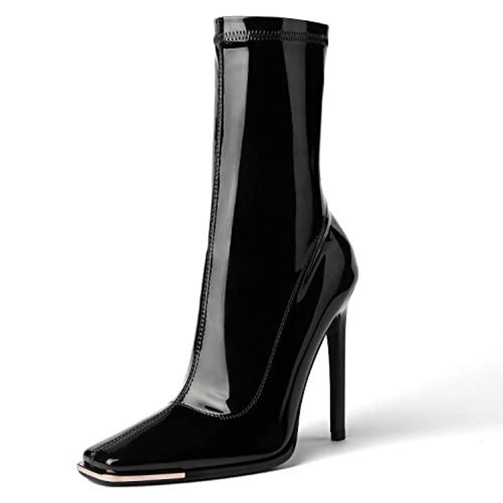 Amp up your look with some boots that aren't sparkly so much as sleek. These mid calf boots have a sexy stiletto heel and are a slick, shiny black that works with any outfit.