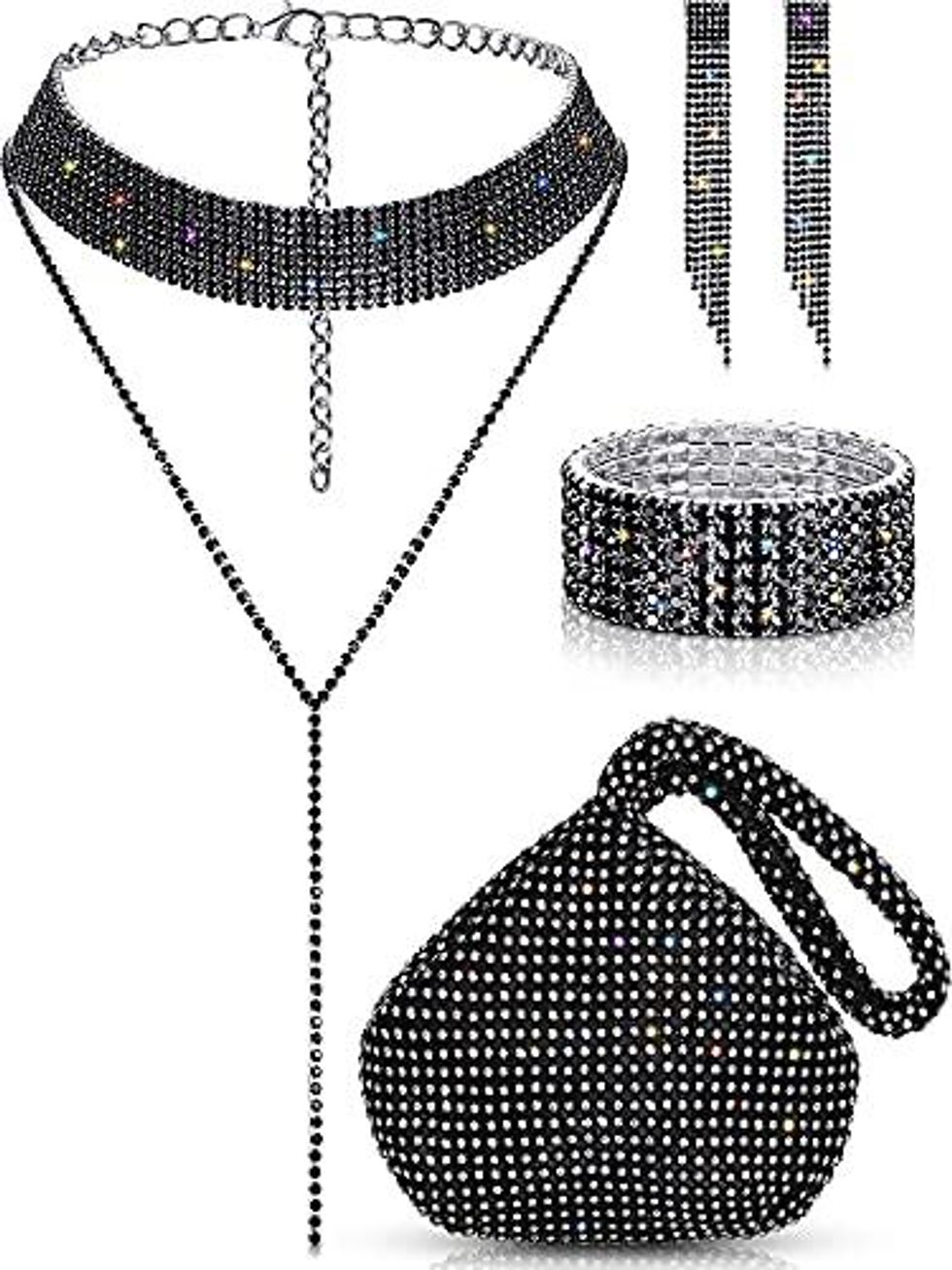 If you're not sure how to add that extra pizzazz to your style, jewelry is the way to go. This set of 4 rhinestone pieces will have you glittering all night long, with cuff bracelet and necklace, draping earrings, and a clutch.