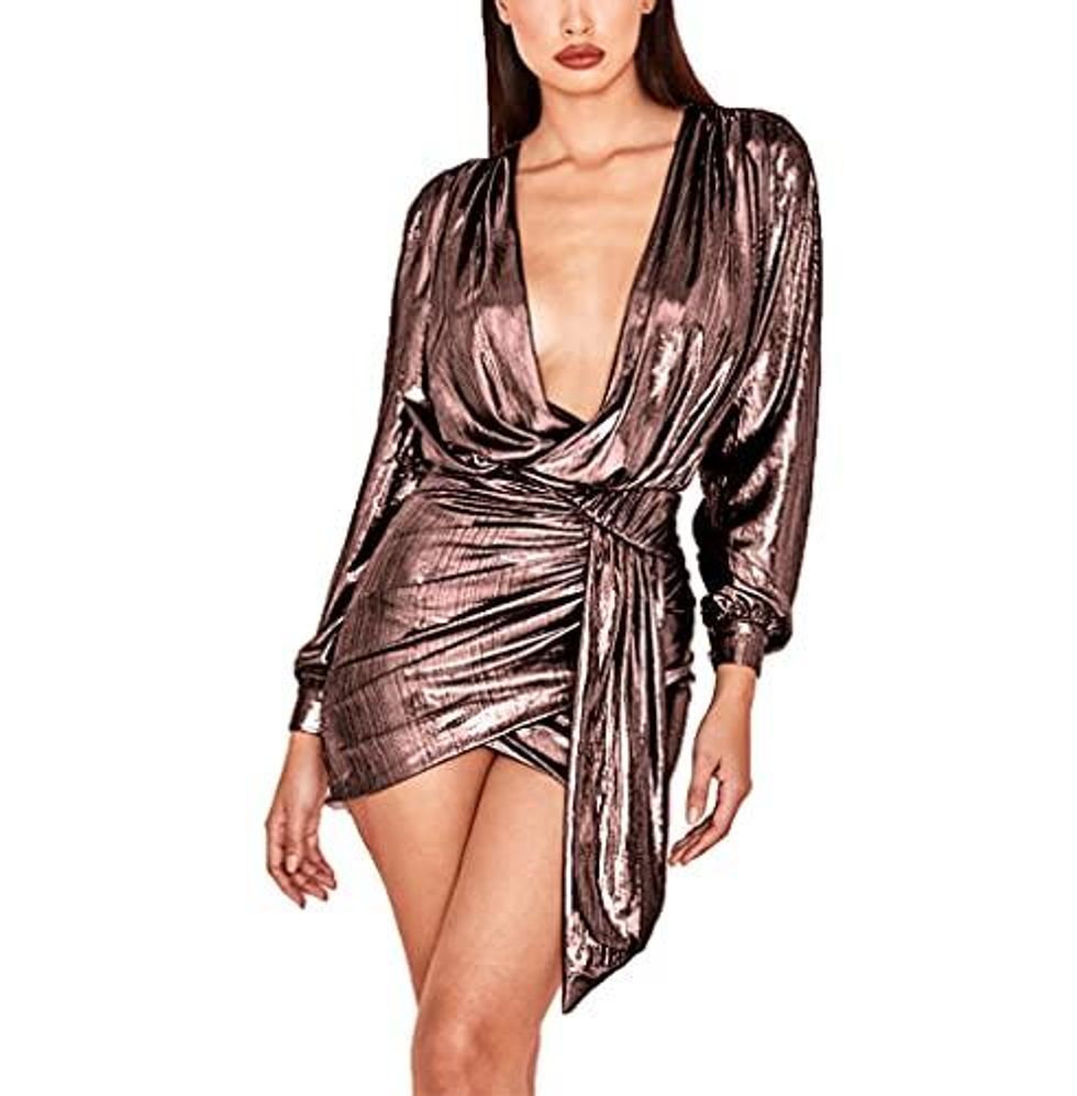 Going for a sultry style? This drape dress shows off hints of skin while still looking super elegant. Thanks to the metallic fabric, you'll feel particularly celebratory.