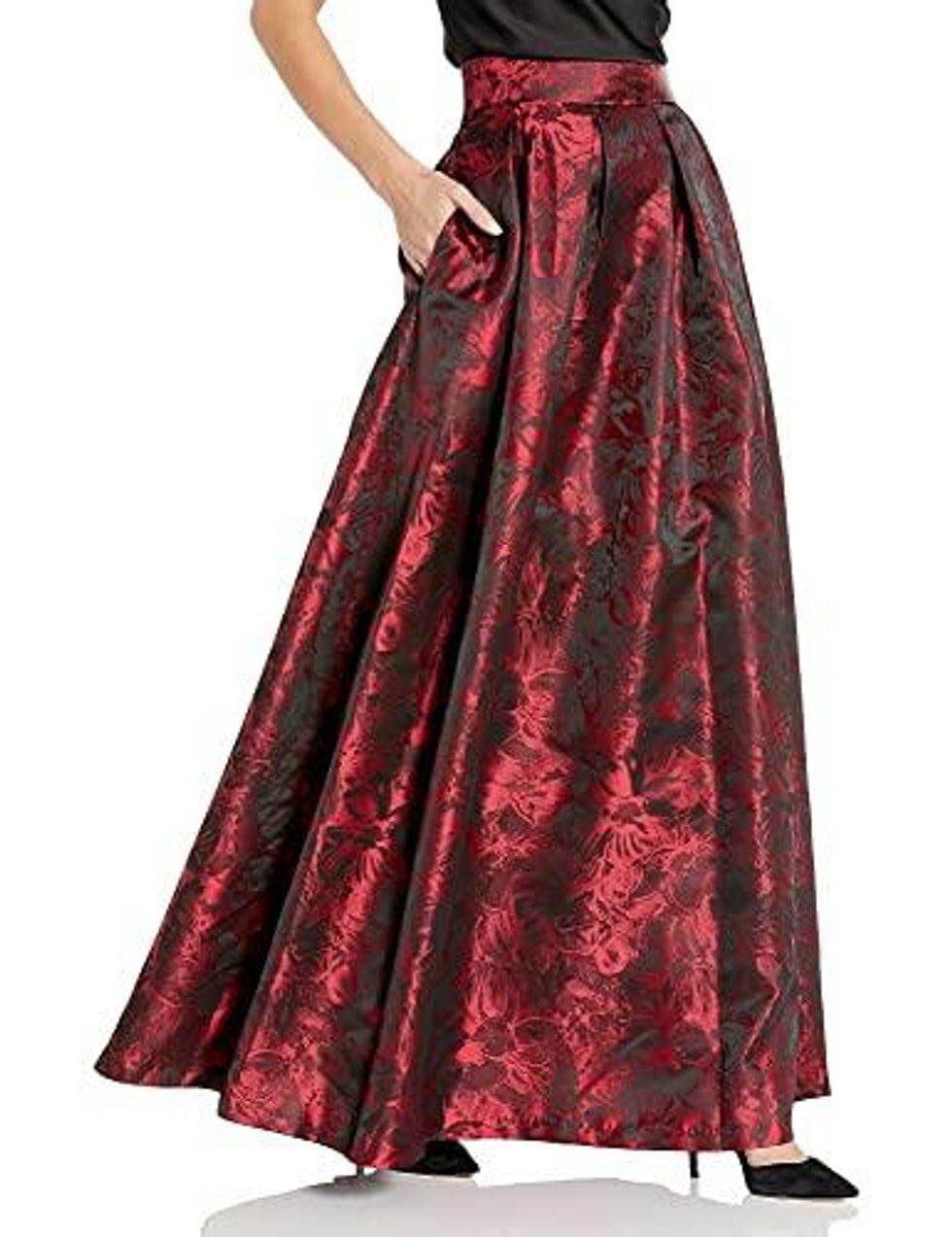 Another super classy option is this satiny ballgown skirt with a subtle black-on-red pattern that takes any look up a notch. Pair it with a sequin cami for extra fun, or add a simple bodysuit to keep it sleek.