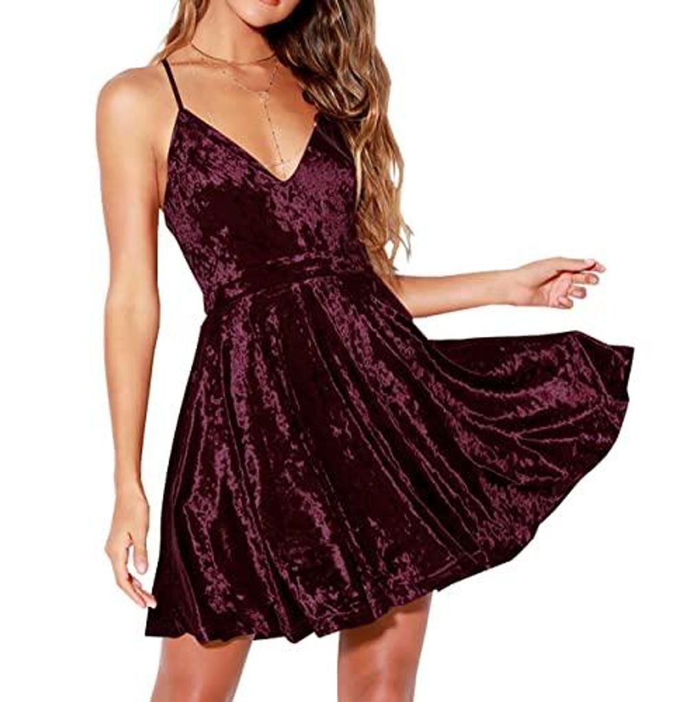 If you're going for a fun, carefree vibe, you can't go wrong in a skater dress, and since this one is made of velvet it will feel just right on a celebratory night.