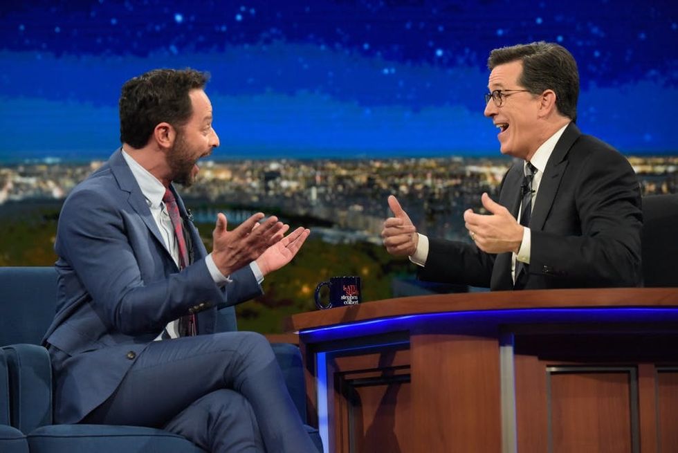 For your viewing pleasure, Colbert and Kroll are digging up the most painfully awkward snaps of the rich and famous — all in the name of charity, of course. Both the host and The House star kicked things off by giving Colbert’s audience a look at their own 13-year-old selves, with the comedian’s having come straight from gym class (i.e. sweaty) with a tie and jacket borrowed from the photographer because he “forgot” it was student photo day.