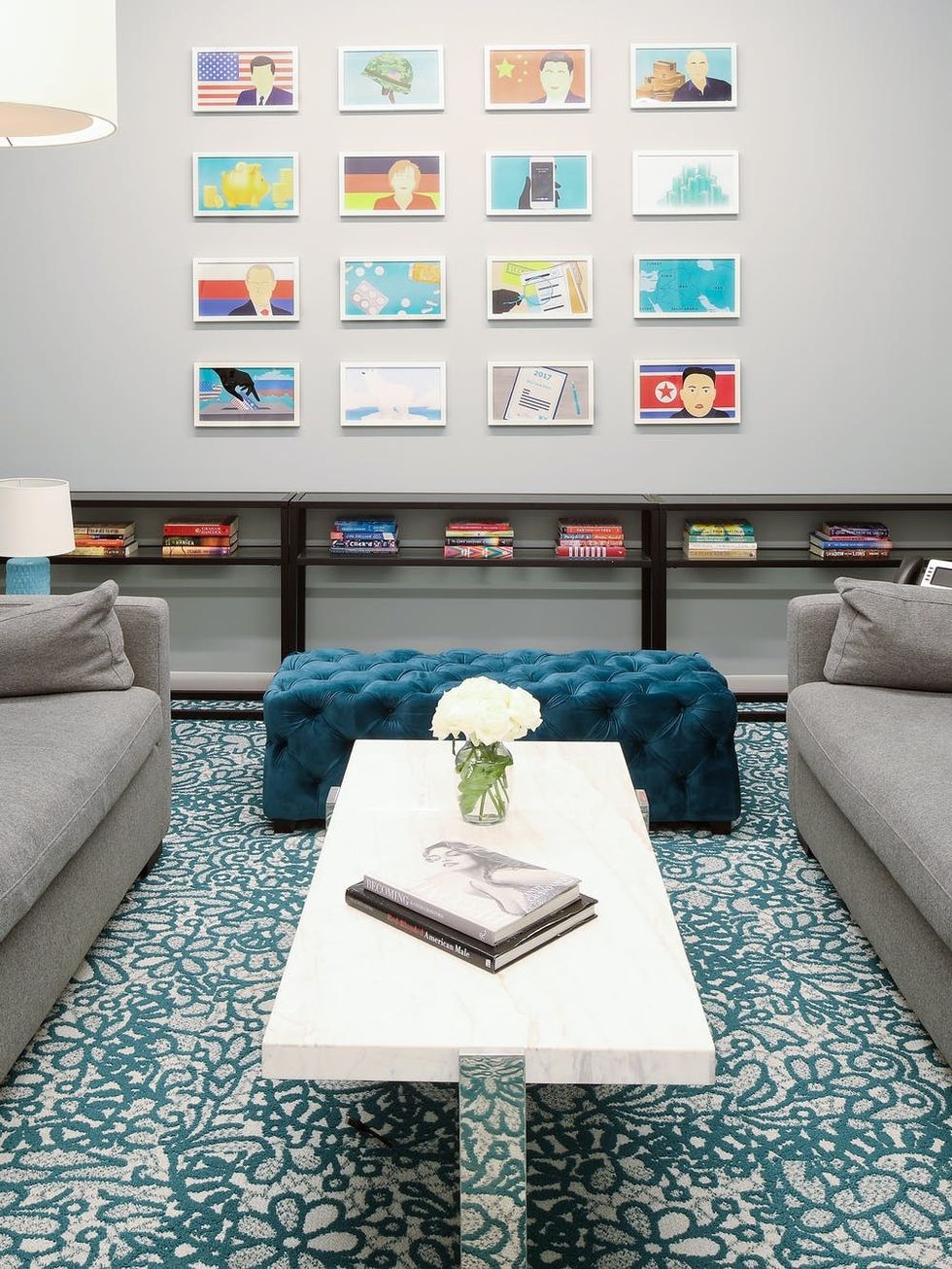 The brand’s signature teal makes a bold and bright appearance throughout the offices, lending an energizing pop to each zone. “Our headquarters’ aesthetic is simple, bright, and comfortable,” says Carly Zakin, co-founder of theSkimm. “We focused on finding pieces that were evocative of the brand and pieces we’d feel comfortable putting in our own homes.”