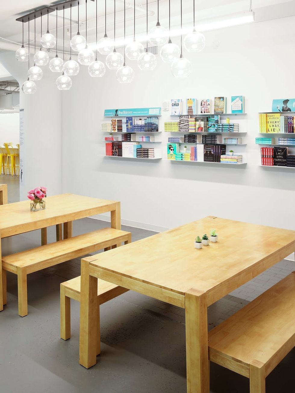 Hayneedle-exclusive dining tables serve many purposes in TheSkimm’s offices, subbing in for desks, conference tables, and other casual gathering spaces. The effect, Weisberg notes, is much warmer than most workspaces: “We were careful in selecting furniture that never felt too ‘corporate.'”