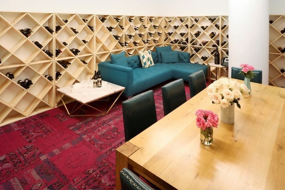 Wall-to-wall wine racks bring a bit of added texture into this conference room, and make it a go-to destination for happy hour. (Having a wine room is very on-brand for TheSkimm, but why doesn’t every office have this?!)