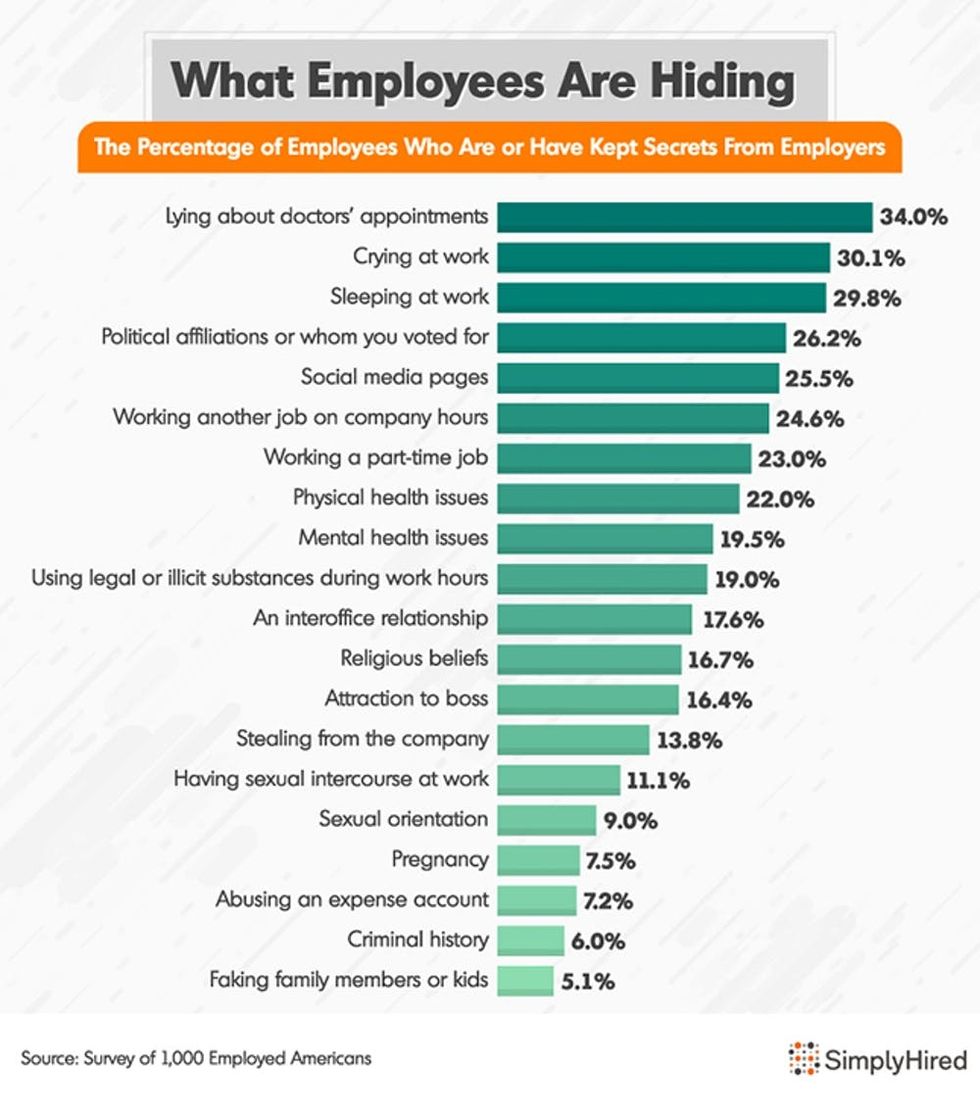 SimplyHired recently surveyed 1,000 American employees about the state of candor in the modern workplace. While the percentage of people who admit to actively keeping secrets from their employers is pretty low — just eight percent, for example, say they’ve hidden a pregnancy, while a third have lied about a doctor’s appointment — there remains a gray area for many of us about what is and isn’t up for discussion when we cross the office threshold.