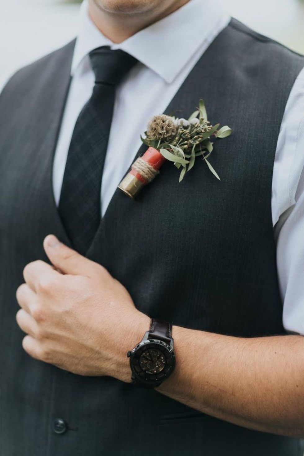 It’s the tiny details, like these shell-casing boutonnieres, that put the couple’s unique touch on the typical forest-friendly nuptial decor.
