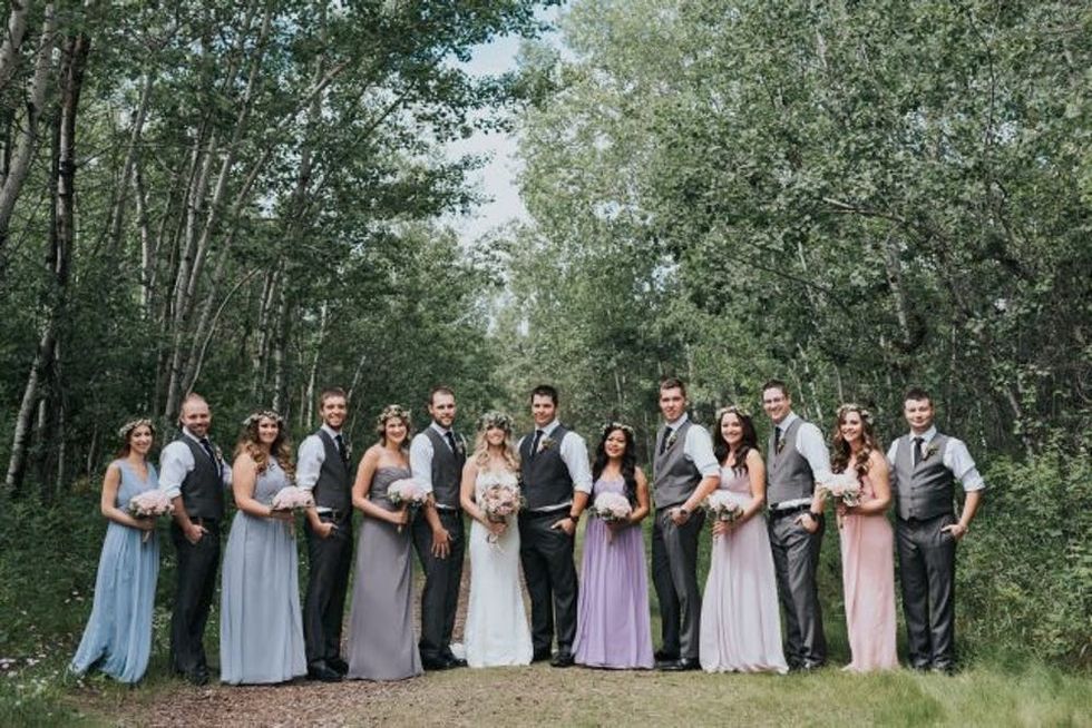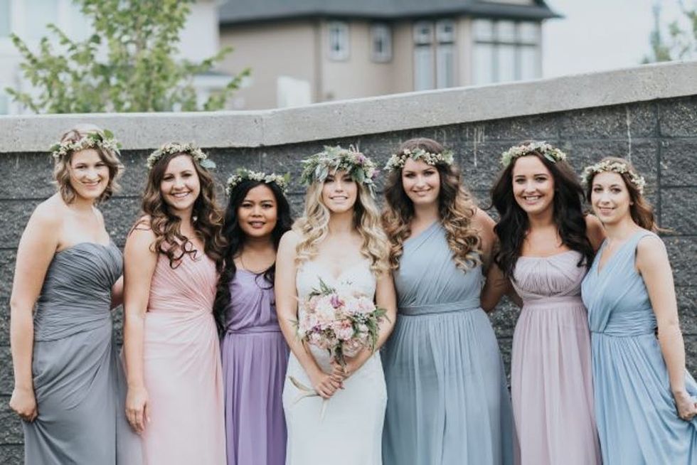 The bridesmaids wore flowing, pastel-colored dresses to match the bride’s bouquet and blend with the breezy scenery. Their look was topped off with smaller versions of those must-have boho-chic floral crowns.