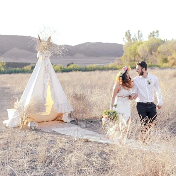 The two lovebirds said “I do” in front of a cozy tipi tent at Murrieta Wine Field. Best part? That gorgeous desert landscape and the boho vibes, of course! Their *dreamy* ceremony proves that you don’t need much to have a decked-out ceremony backdrop. If you’re digging this idea for your own nuptials, all you need is an open field and minimal decor that matches your style.
