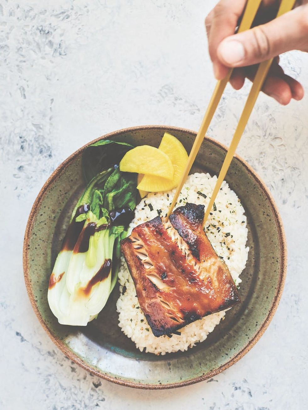 5. Wipe off any excess sauce from the top of the fillets and arrange them, skin side down, on the foil-lined baking sheet. Broil until the fish flesh is almost opaque, 8 to 10 minutes. Broil for a minute or two to caramelize the top of the fish; it’s done when the outer edges start to blacken. Serve with steamed rice, furikake, and baby bok choy.