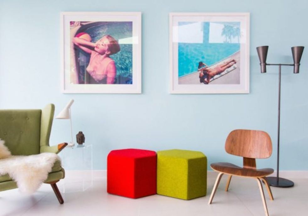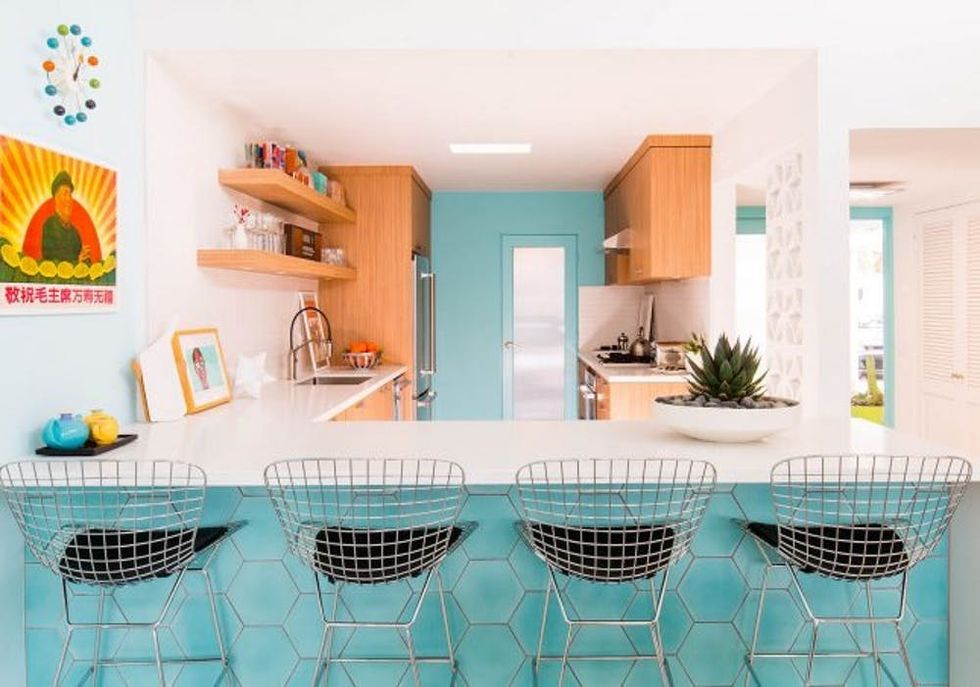 “We kept the modernist style intact by incorporating details that were typical of the period,” says Tabb, “such as the breeze-block partition wall and the stack-bond tile layout of the bar’s backsplash.” Pairing these features with the white Italian porcelain floors and authentic Bertoia stools ensured the space didn’t lose touch with its mid-century roots.