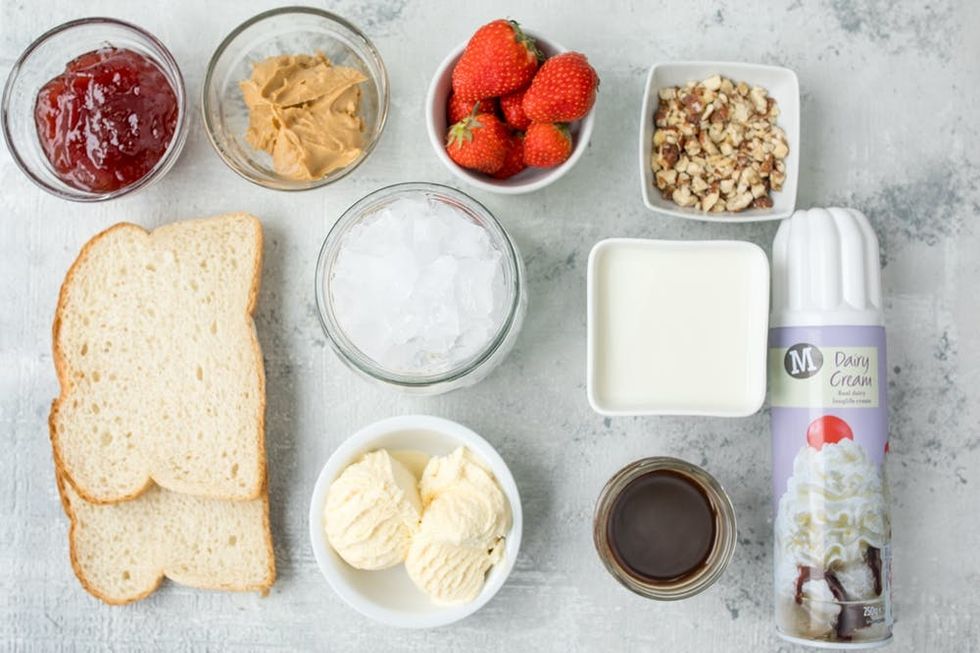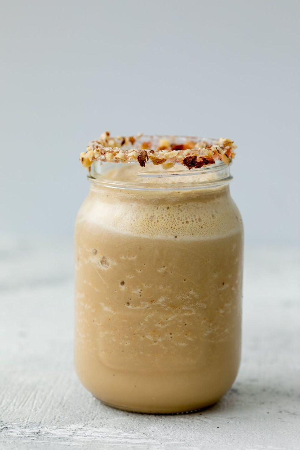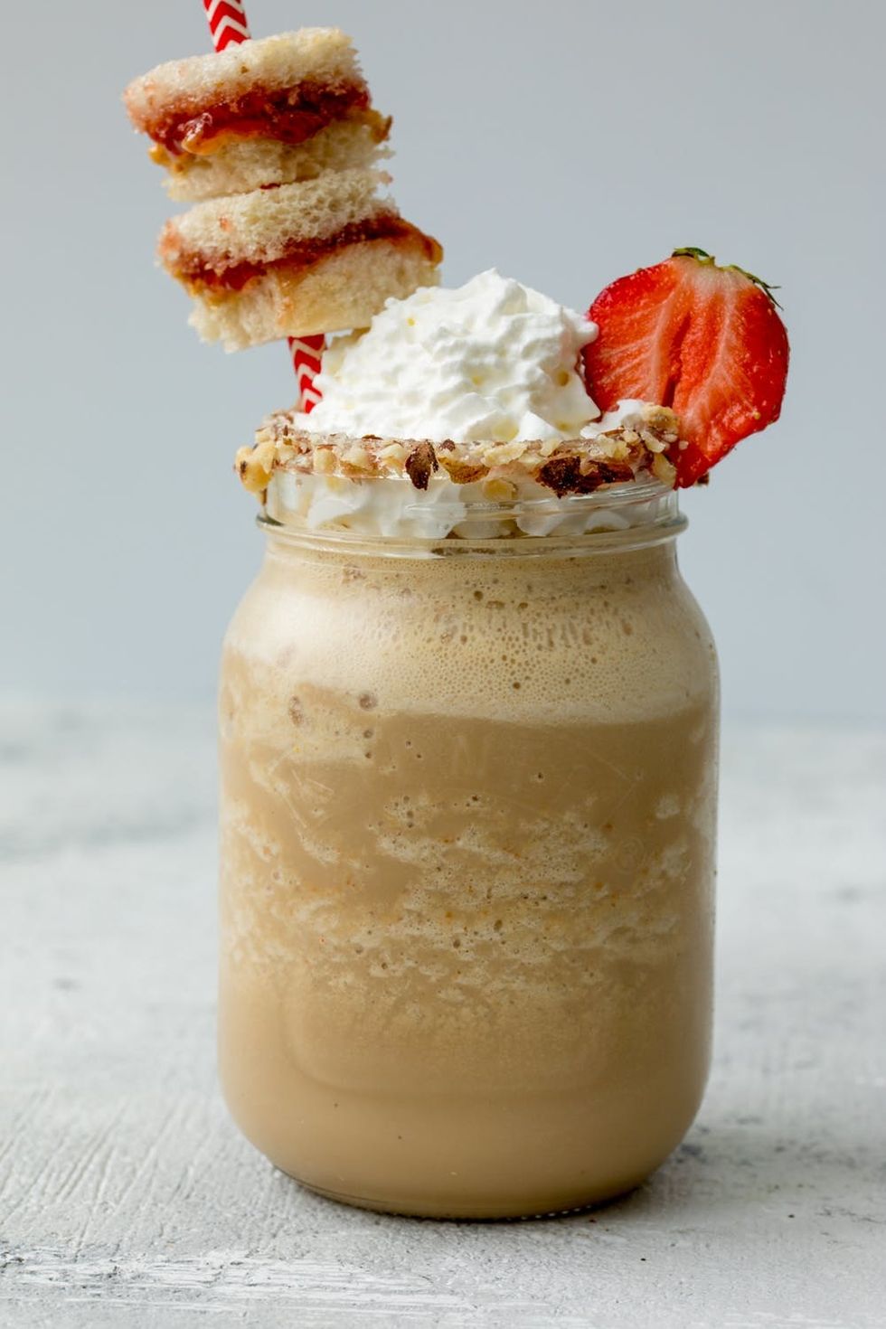 - Place the remaining peanut butter, remaining strawberry jelly, espresso, ice cream, milk, and crushed ice into a blender. Blend until smooth. Pour the frappuccino into the two glasses. Pipe on the whipped cream, add a sliced strawberry to the rim of each glass, then sprinkle on any remaining crushed nuts.