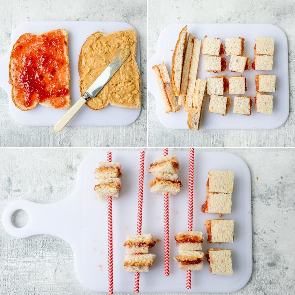 - Spread two tablespoons of peanut butter on one of the slices of bread. Spread two tablespoons of strawberry jelly on the other slice. Sandwich together, cut off the crusts, and cut into 12 squares. Take two straws and thread two squares on each (or use skewers).