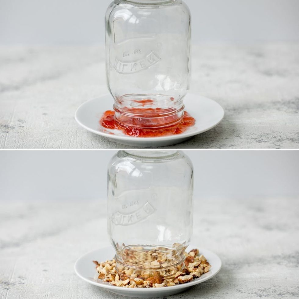 - Place one tablespoon of strawberry jelly on a plate and place an inverted glass onto the plate, so the jelly sticks to the rim. Place the crushed nuts on another plate, and dip the rim of the glass in the nuts, so the nuts stick to the glass. Repeat with the other glass.