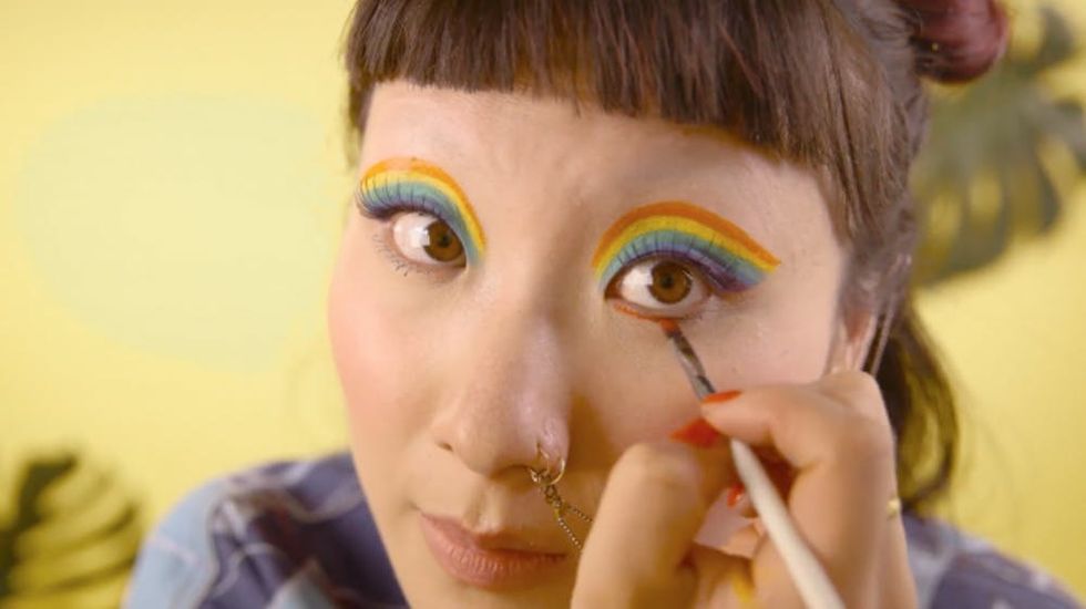 From there, you simply apply layers of shadow with an angled synthetic brush, beginning with blue and working your way through the ROYGBIV color scheme (though you can certainly mix and match color order for varied effects, as well). Allure recommends keeping each line crisp, or, for an alternate look, you can get a bit smudgy. Makeup artist @yuuivision walks us through the process in the video above.