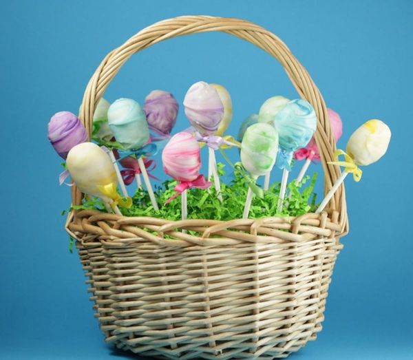 Repeat this process with up to 5 other colors. Note: Not all of your Easter egg cake pops will fit in the basket. After the first batches harden, transfer them to a baking sheet and place in the freezer. Use the basket to let the later batches set up, and then re-arrange your pops in the basket as desired at the end.