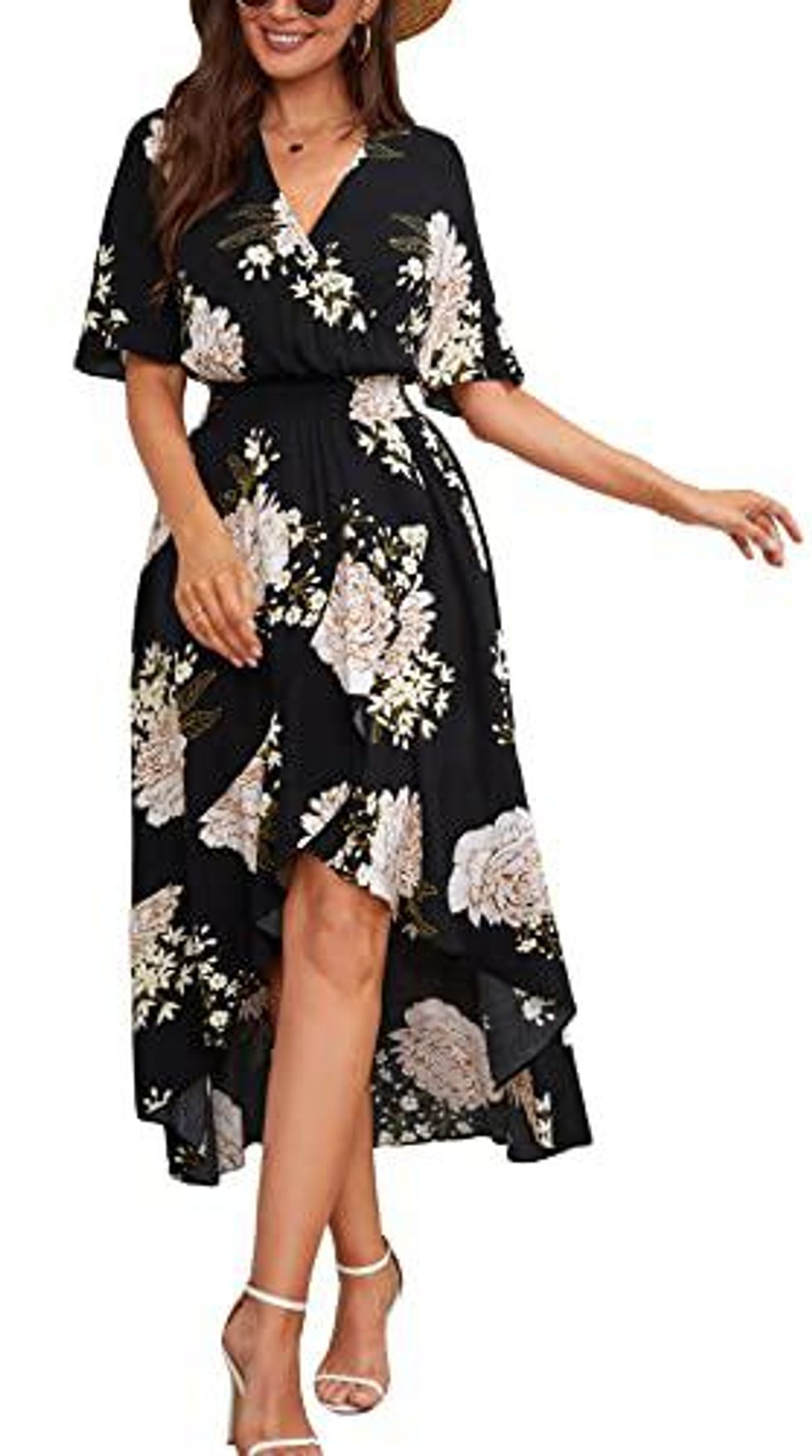 If you're planning on hitting the beach on vacation, you're going to need a floral outfit. Whether you're sunbathing on the sand or drinking beachfront, you'll fit the vibe perfectly in this Kormei Womens Short Sleeve Floral High Low V-Neck Flowy Party Long Maxi Dress.
