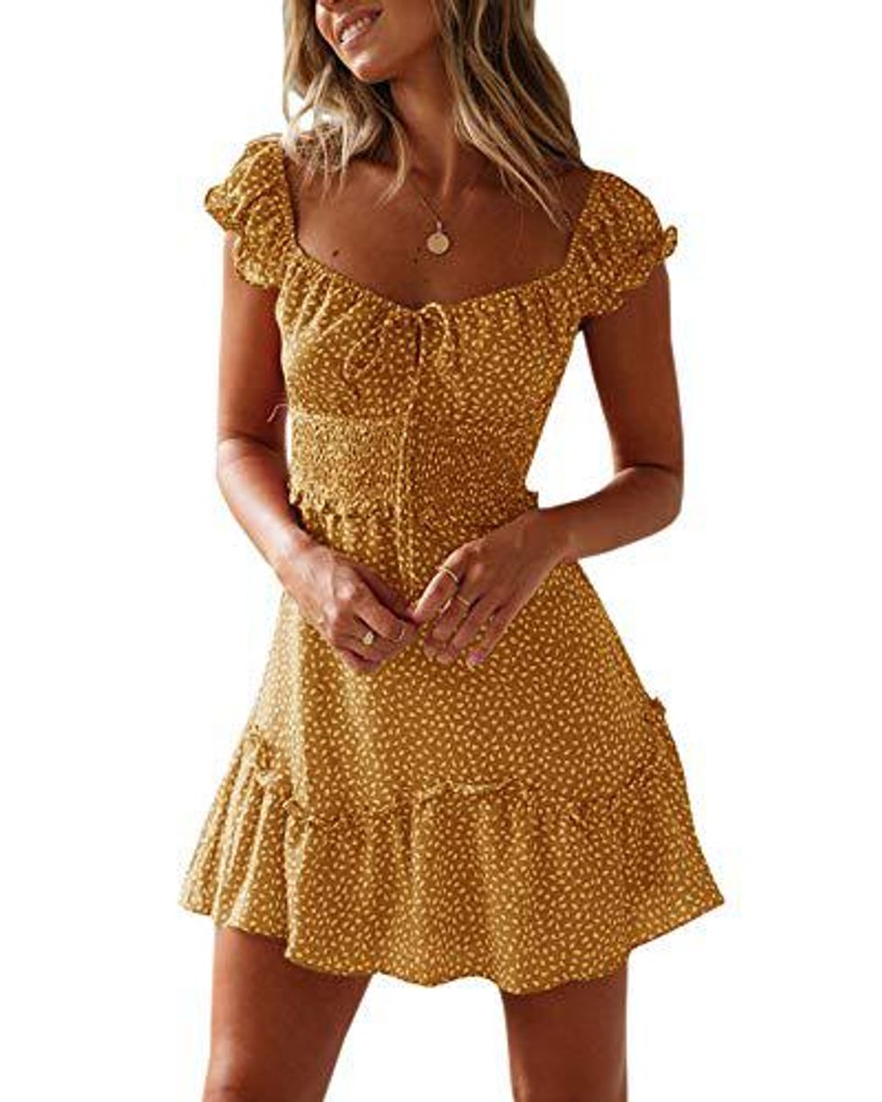 Bring a little brightness to your vacation. The YOBECHO Women's Summer Ruffle Sleeve Sweetheart Neckline Printing Dress in yellow will have you feeling like a ray of sunshine. Pair this bright-colored dress with some white shoes and gold jewelry.