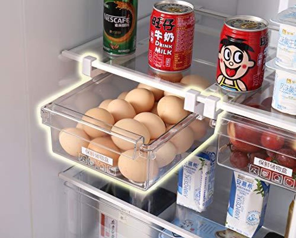 There's so much unused space in our fridges! This Fridge Drawer has an adjustable base that will latch on to any sized shelf. The drawer easily slides in and out, and it can hold things like eggs, peppers, and cheese!