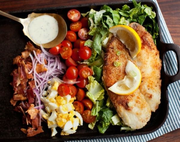 1. Cobb Salad: Give a classic Cobb salad a new twist with some crispy tilapia fillets. Swap out or omit any of the other ingredients to make it just the way you like it. (via Plated)