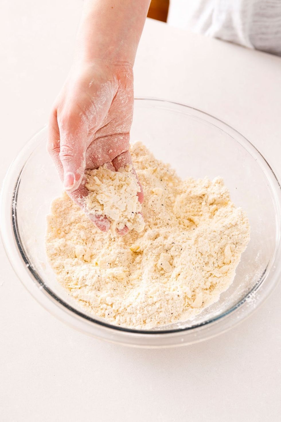 2. Use your hands to rub the butter into the flour mixture, until it resembles wet sand.