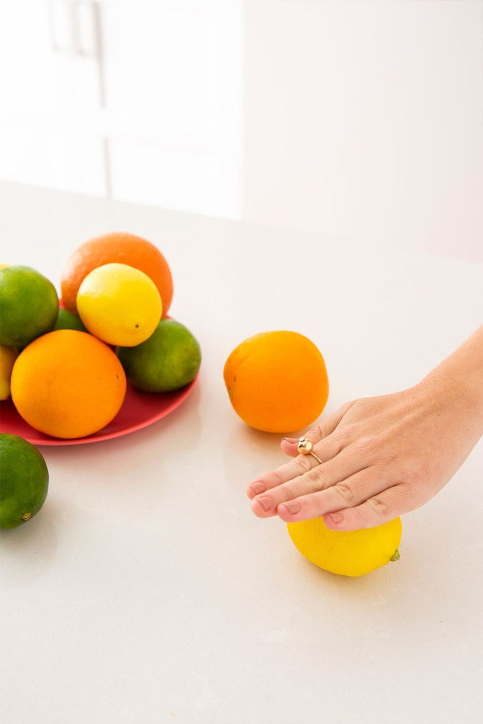 First up: Put your citrus in the freezer. Because this step can be a bit impractical for impromptu occasions, we like to always have a couple lemons or limes frozen and ready to go. Once you remove your produce from the freezer, pop it in the microwave for about 30 seconds to defrost it. Finally, use the palm of your hand to roll the citrus on a hard countertop. Happy juicing!