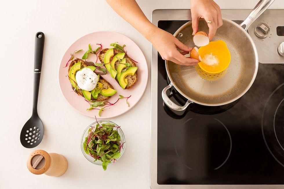 What you will need: eggs, white vinegar, and this genius OXO Silicone Egg Poacher to do the hard work for you! Place the tool (solid side up) in your pan and fill with water until you hit the marked measurement line. Once your water is boiling, add a splash of white vinegar to help solidify the egg white. Crack an egg right into the egg poacher. Depending on the size of the egg, set a timer for about three minutes and 30 seconds. Ta-da! Remove the contraption to find the perfect poached egg. Finally, use a slotted spoon to transport it to a paper towel. This will remove excess water.