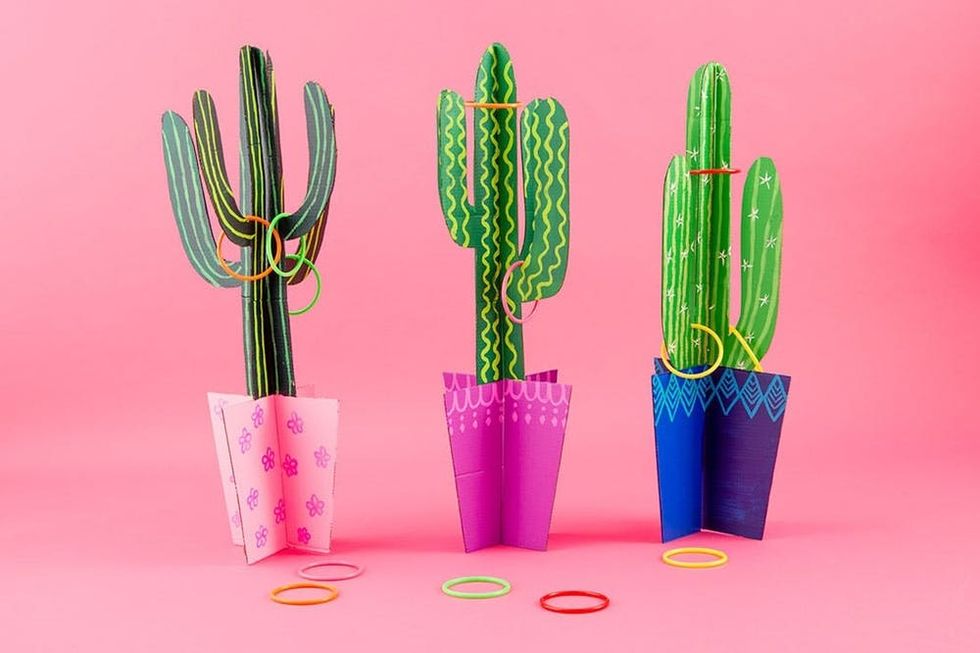 Ring toss has been around for a while, so we figured it was time for an upgrade. We cut two cactus silhouettes using an X-acto on foam core. Give it a fresh coat of green spray paint and then ad spikey designs with paint pens. Cut a slit halfway from the bottom one cactus cut-out, then on the other, cut a slit halfway from the top. Slide the two pieces together to create a 3D piece. To make it even sturdier, stick the foam cactus into a terracotta pot and surround it with sand to keep it from tipping over. Whoever gets the most rings on the cactus arms is the winner! (via Brit + Co)