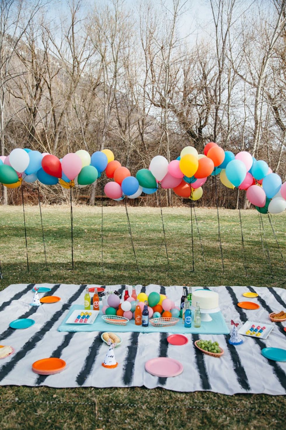 I mean, who doesn’t get excited when they see a bunch of balloons!? Creating a balloon fence is a festive way to close off an area in a public space to make it feel like a private party. Buy 36-inch balloon sticks from your local party store. Thread the ribbon of five helium balloons through the top of the plastic balloon stick and tie into a knot. What’s great is that these sticks already have stakes on the bottom for you to plant into the ground, but if you are stuck inside, simply stick the stake into a block of floral foam or styrofoam. (via The House That Lars Built)