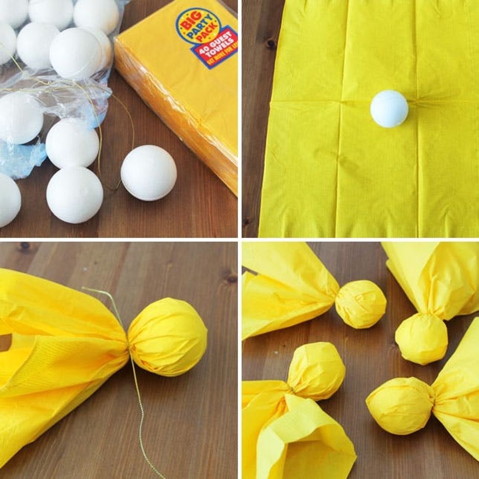 Take a ping pong ball, wrap a yellow or orange napkin around it, tie, and you’re done. If you’re 21+, feel free to repurpose the ping pong balls for a game of beer pong during halftime ;)