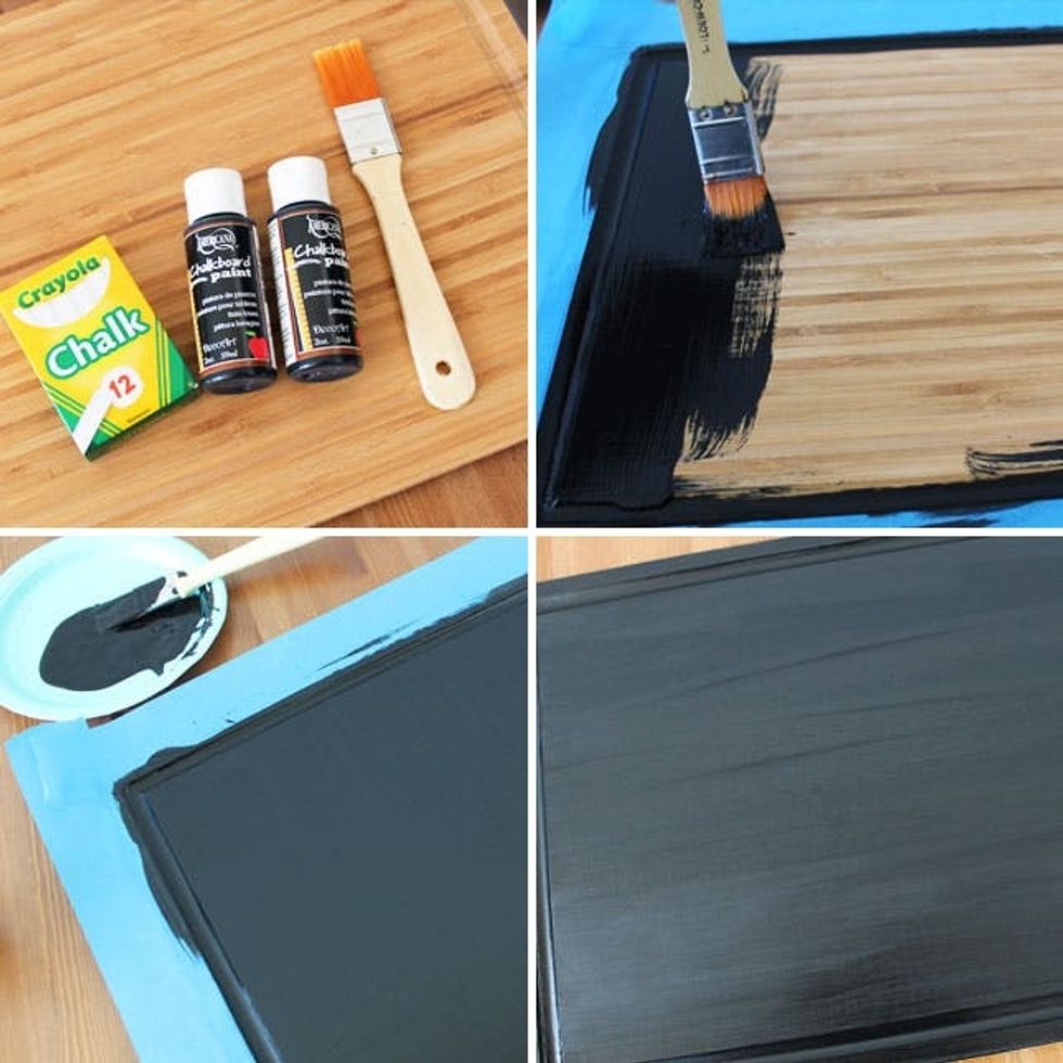 Use painter’s tape to tape off the edges, paint two layers of chalkboard paint, and you’re good to go.