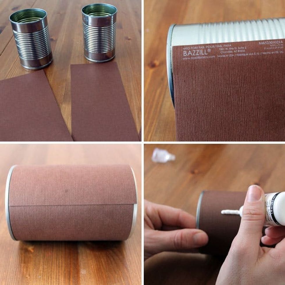 You’re probably already planning on using canned food for your apps and snacks, so why not turn those cans into serving containers as well? Just like the treat cones above, all this one takes is some brown paper, tape or glue, and white paint. We’re also obsessed with the metallic plastic silverware we used! It looks totally real but is disposable. You can snag some of your own at Party City.