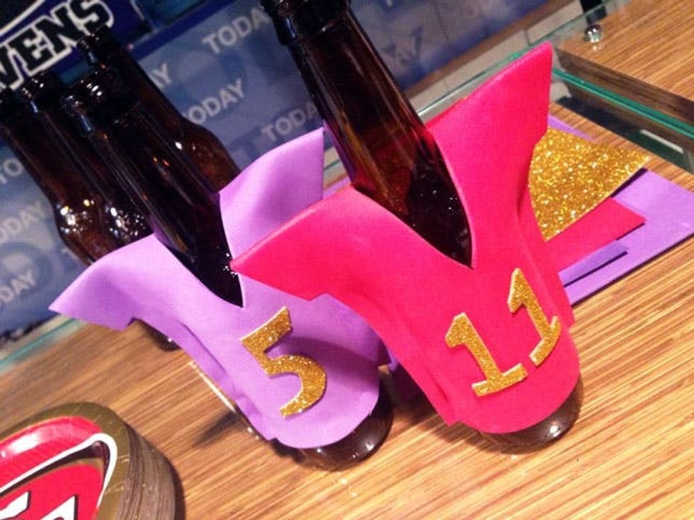 To make, fold a piece of foam in half, cut out a t-shirt shape, and use glue to secure the sides. Then just add your favorite players’ numbers and stick ’em over your bottles for guests to grab.