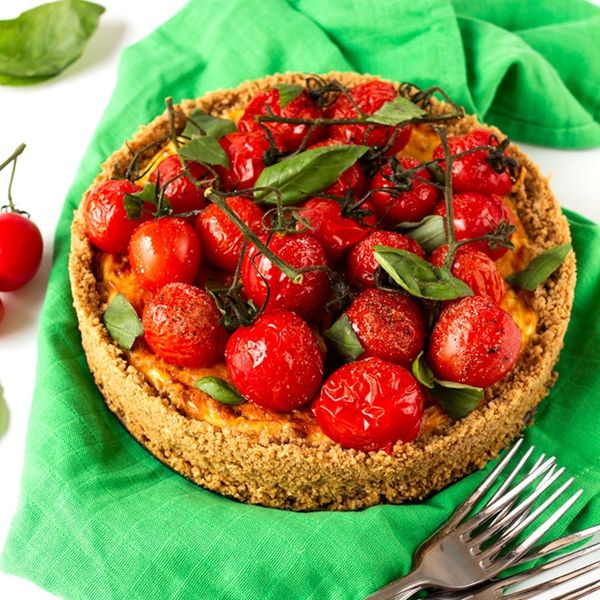Did you know it’s National Cheesecake day on July 30? Sweet and fruity cheesecakes are, of course, awesome. But we decided to make a delicious savory cheesecake to celebrate the day. With a buttery oat biscuit base and garlic and cheese filling, all topped off with juicy baked tomatoes and fresh basil, this cheesecake stands out in the crowd. Serve it with a fresh salad for a simple make-ahead dinner.
