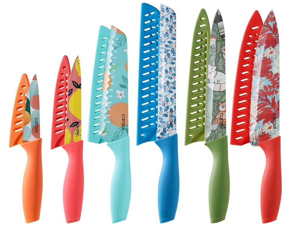 Carote's 12-piece knife set is so fun and colorful that you'll search for things to chop. The knives score high marks for gift ability and are lightweight, easy to hold, and easy to clean. Each knife comes with a blade guard for safe storage.