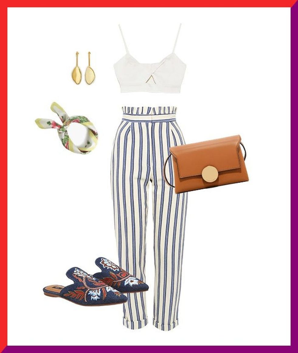 Zara Crop Top ($26), Topshop Stripe Ruffle Peg Trousers ($75), Mango Floral Embroidered Denim Shoes ($80), Charles & Keith Cognac Circular-Buckle Slingbag ($59), Bing Bang NYC Calder Drop Earrings ($180), J.Crew Italian Silk Square Scarf in California Map Print ($50)