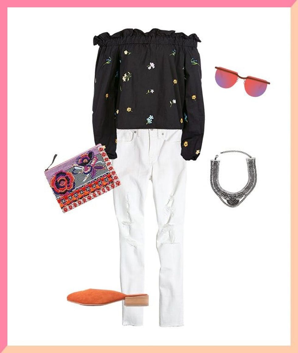 H&M Off-the-Shoulder Top ($40), Madewell 9-Inch High-Rise Skinny Crop Jeans in Pure White: Destructed Edition ($135), Jeffrey Campbell Mula 2 ($125), DLNLX by DYLANLEX Gala Necklace ($88), Anthropologie Beaded Flower Pouch ($88) + Le Specs Mafia Moderne ($89)